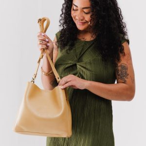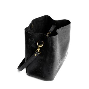 - Spacious bucket shape with delicate brass-toned hardware accents
